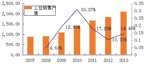 我国模具行业尽管起步较早,但初期一直作为下游生产企业的附属企业,模具商品流通率较低,限制了模具企业的发展。直至1987年, 模具才作为产品被列入机电产品目录, 当时全国共有生产模具的厂点约6,000家, 总产值约30亿元。经过20多年的发展, 中国的模具工业已有了长足的进步,截至2013年,企业数量达3万家,年产值达2,200亿元人民币,年出口接近50亿美元。目前,我国模具行业的最大市场是汽车行业、电子信息行业、家电和办公设备、机械和建材行业。随着我国国民经济的迅速发展,人民收入水平的提高,对汽车、电子消费产品、家电等的需求不断增加,使得这些行业近年来进入一个高速发展的阶段,成为我国模具行业迅速发展的一个重要原因。下图为2007-2013年我国模具产值图,可以看到,近年来我国模具行业产值增长迅速,已经从2007年的870亿元增长到2013年的2,106亿元,增长率远高于世界模具行业整体水平。