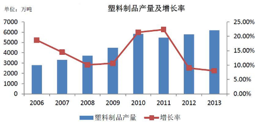 2013年我国塑料制品产量6,188.66万吨,同比增长8.02%;截至2014年12月,塑料制品规模以上企业14,062个;完成主营业务收入20,392.39亿元,同比增长8.92%;利润总额1,182.86亿元,同比增长4.24%;实现出口交货值2,260.66亿元,同比增加了2.82%。由此可见,塑料制品行业在我国的产业规模在不断扩大,其产量也逐年提高,同比增长率近两年有所放缓。