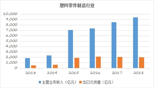 其中塑料零件制造业的主营业务收入及出口交货值在近5年内呈现上升趋势,2010年至2011年间增长尤为迅速,主营业务收入从2,372.82亿元增长近200%至7,095.59亿元,出口交货值从635.79亿元增长至1,914.26亿元;2012年至2014年间增速虽有所放缓,但主营业务收入仍在扩大,截至2014年已达到9,394.13亿元。