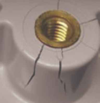 Plastic and metal coefficient of thermal expansion difference of 5 to 10 times, so with metal inserts of plastic parts in the cooling, the two constitute the shrinkage of the size of the Division, because the plastic shrinkage ratio is large and firmly embrace the metal inserts, in the inserts around the inner layer of the plastic by the compressive stress, and the outer layer by the tensile stress, resulting in a stress concentration phenomenon.